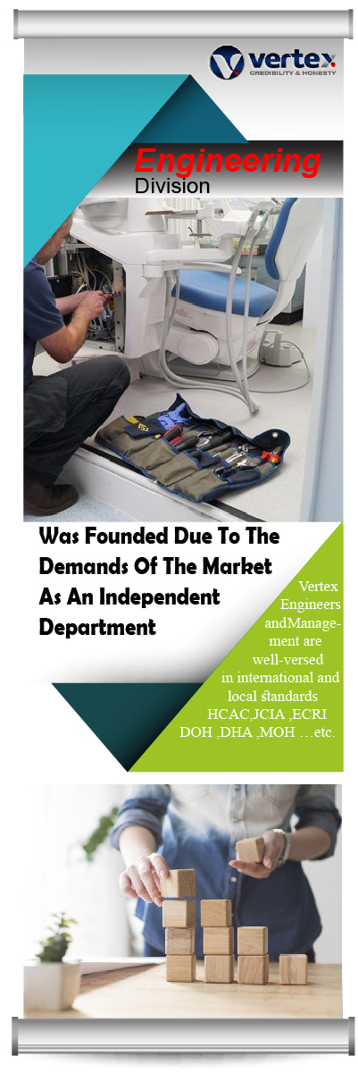 Our team is composed of highly-trained Engineers and Technicians who are supported by Logistic Department and Senior Management. Vertex Engineers and Management are well-versed in international and local standards (HCAC,JCIA ,ECRI ,DOH ,DHA ,MOH …etc. )
